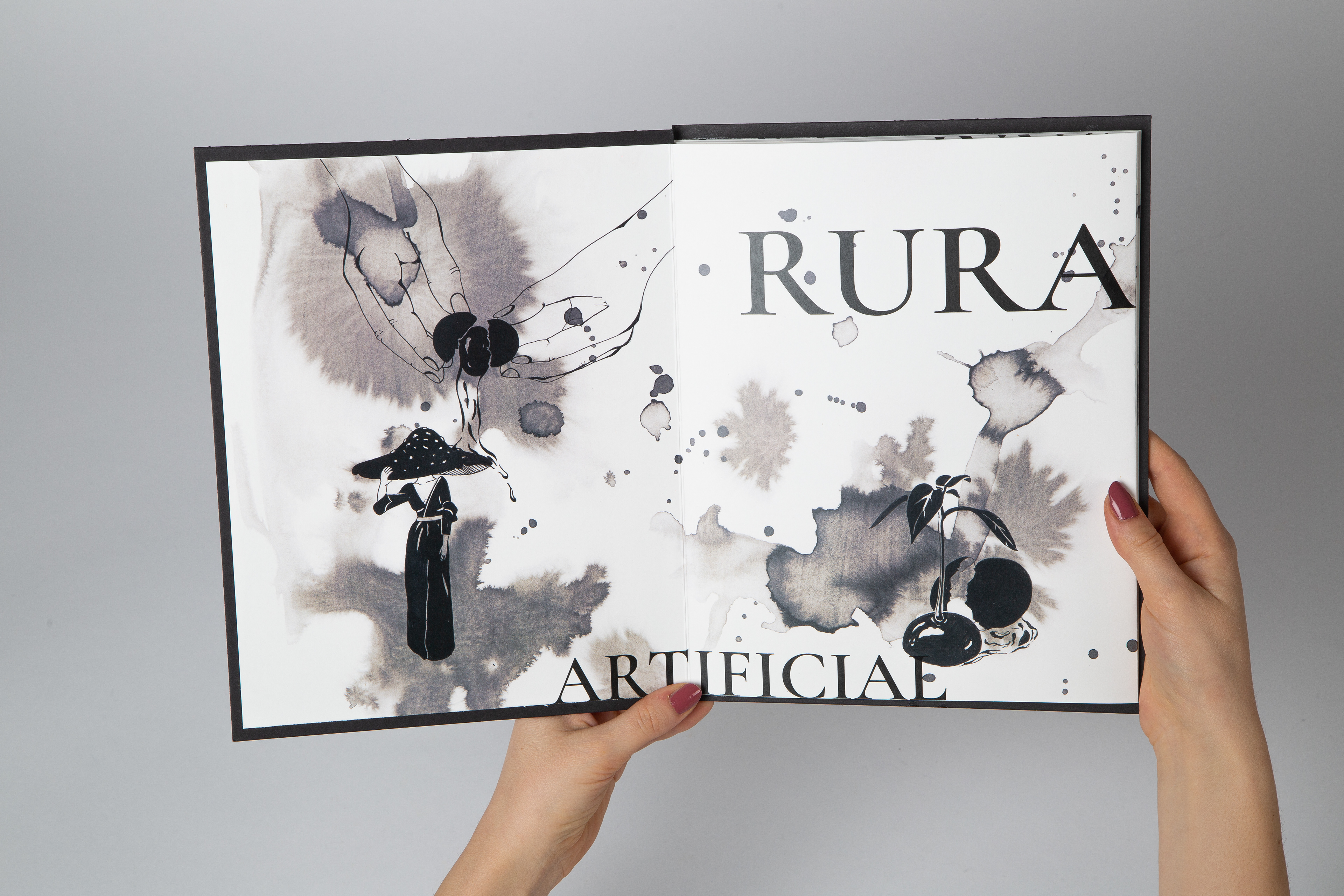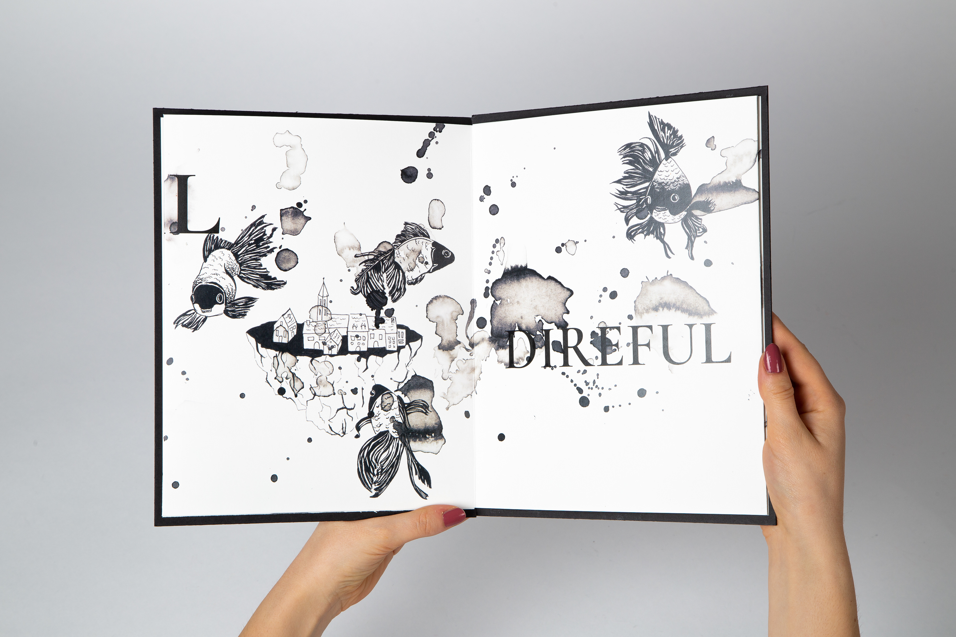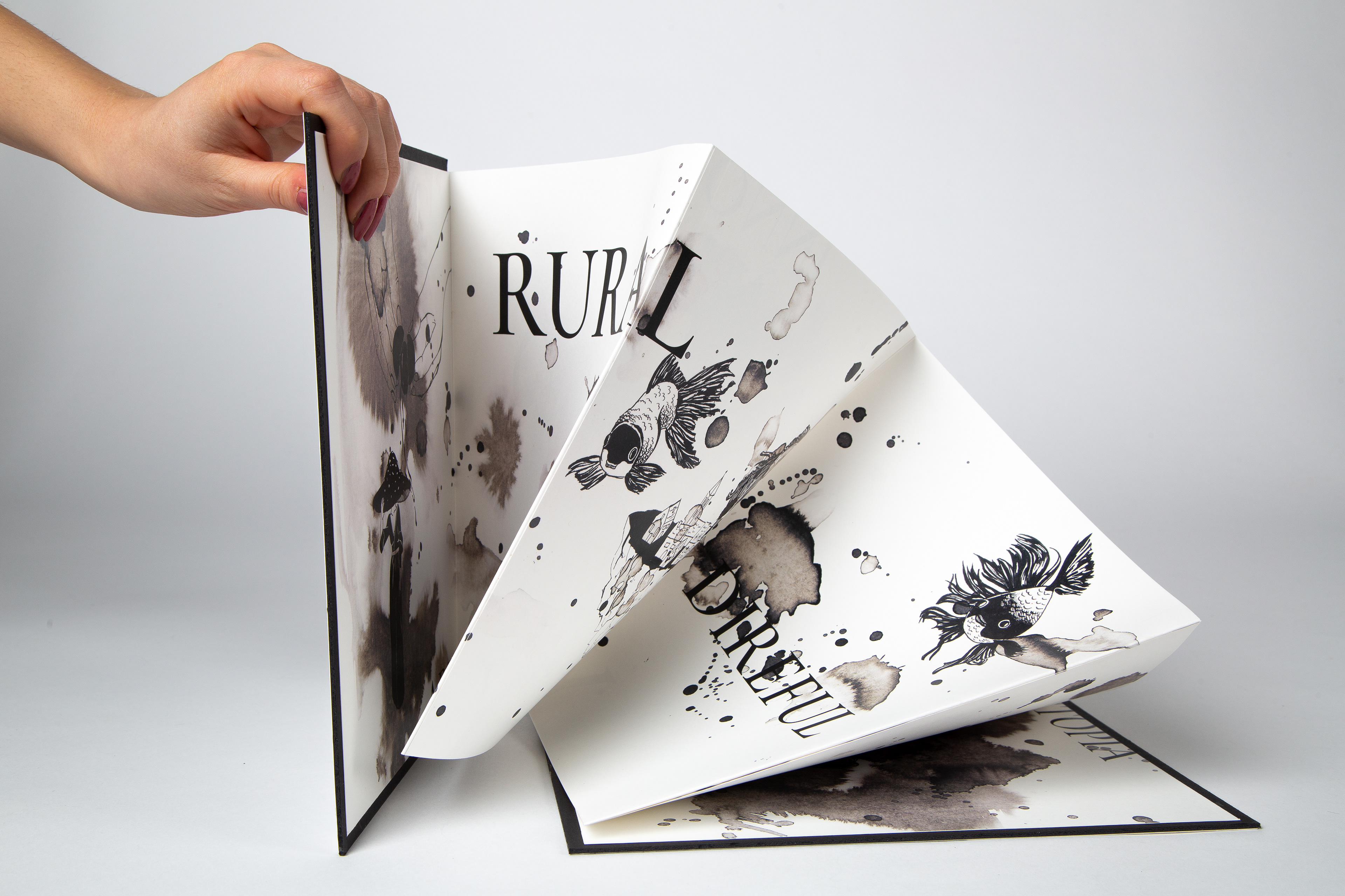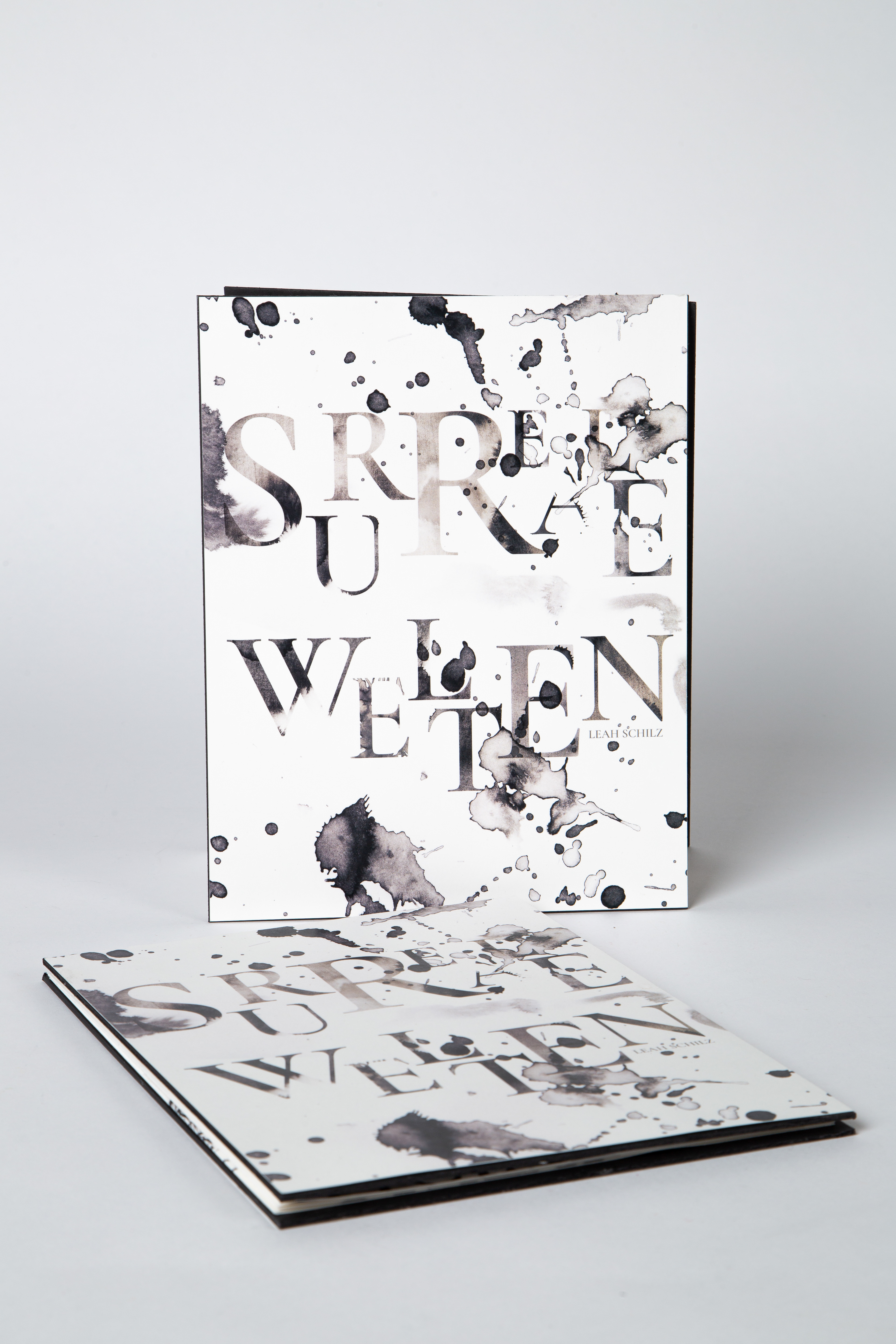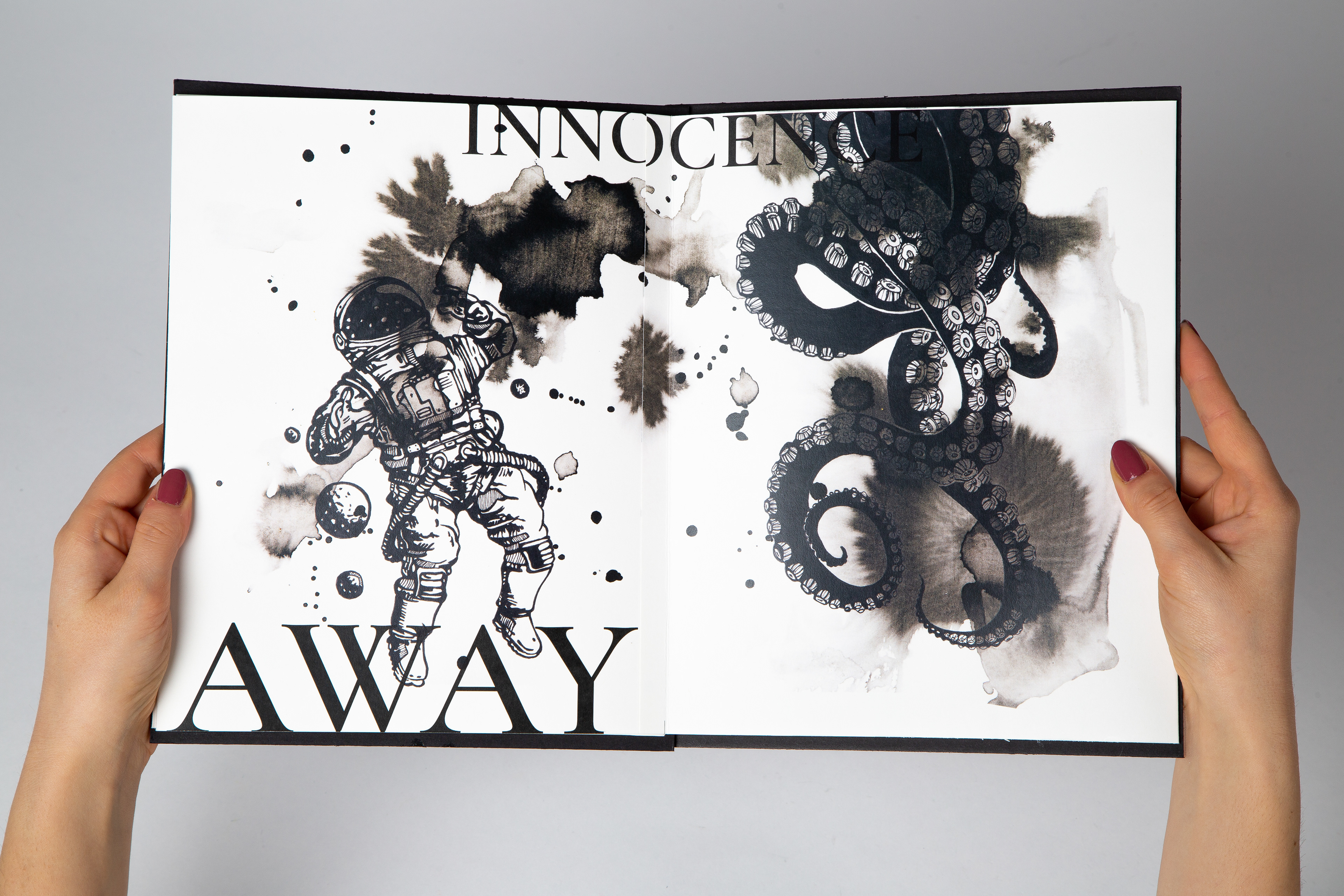 This leporello with the title "Surrealistic Worlds" has been designed on the theme of surrealism. Ink spots connect the individual elements, which are also drawn with ink.
